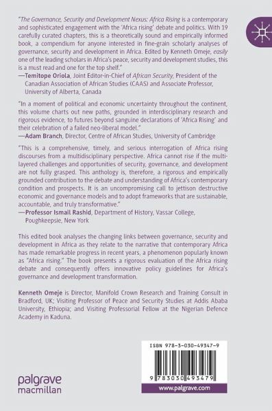 "The volume is ambitious in its attempt to cover the governance, security, and development nexus in breadth and depth. ... the volume does offer interesting insights into the governance and development nexus. ... the collective volume offers an interesting and compelling survey that will be a valuable contribution to the Africa rising debate." (Emmanuel Balogun, Yearbook on the African Union, Vol. 2, 2021)