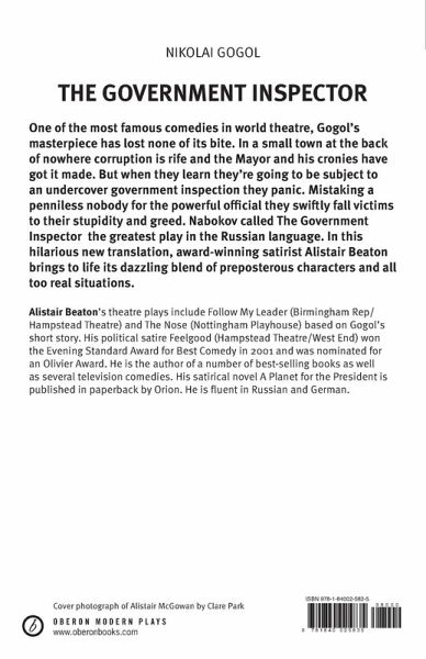 One of the most famous comedies in world theatre, Gogol's masterpiece has lost none of its bite. In a small town corruption is rife, and the Mayor and his cronies have got it made. So when they learn they are going to be subject to an undercover government inspection they panic. Mistaking a penniless nobody for the inspector they swiftly fall victims to their own stupidity and greed. A dazzling blend of preposterous characters and familiar situations, Nabokov called The Government Inspector the greatest play in the Russian language. A production of this version of the play opened at the Chichester Festival in June 2005 starring the comedian Alistair McGowan.