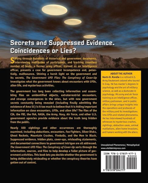 Secrets and Suppressed Evidence. Hidden plots, cover-ups, and misleading statements. Coincidences or Lies? Sifting through hundreds of historical and government documents, interviewing multitudes of participants, and tracking countless leads, a former army officer, trained as an intelligence officer, presents a case for government incompetence and, potentially, malfeasance. Shining a harsh light on the government and its secrets, The Government UFO Files: The Conspiracy of Cover-Up investigates what the government knows about encounters with UFOs, alien life, and mysterious activities. The government has long collected information and assembled files on unidentified objects, extraterrestrial encounters, and strange convergences in the skies, but with new government secrets constantly being revealed (including finally admitting the existence of Area 51) is it too much to believe that it is hiding important information on close encounters, UFOs, and alien life? Combing FBI, FAA, and other government files, this revealing book thoroughly examined nearly 100 sightings and other occurrences, including ... Alien abductions and encounters Foo Fighters Silver Disks, Ghost Rockets, and Fireballs The SETI search for extraterrestrial life And much, much more The Government UFO Files sorts through the information, sources, and it lets you decide whether the government is being deliberately misleading or whether the conspiracy theories have gotten out of control.