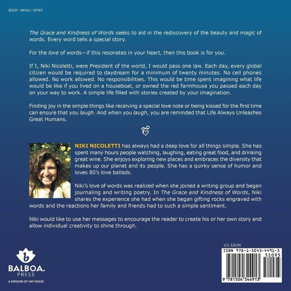 The Grace and Kindness of Words seeks to aid in the rediscovery of the beauty and magic of words. Every word tells a special story. For the love of words-if this resonates in your heart, then this book is for you. If I, Niki Nicoletti, were president of the world, I would pass one law. Each day, every global citizen would be required to daydream for a minimum of twenty minutes. No cell phones allowed. No work allowed. No responsibilities. This would be time spent imagining what life would be like if you lived on a houseboat, or owned the red farmhouse you passed each day on your way to work. A simple life filled with stories created by your imagination. Finding joy in the simple things like receiving a special love note or being kissed for the first time can ensure that you laugh. And when you laugh, you are reminded that Life Always Unleashes Great Humans.