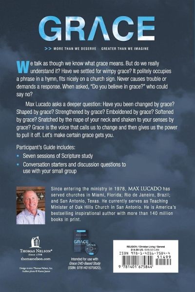 Grace. We talk as though we understand the term. The bank gives us a grace period. The seedy politician falls from grace. Musicians speak of a grace note. We describe an actress as gracious, a dancer as graceful. We use the word for hospitals, baby girls, kings, and premeal prayers. We talk as though we know what grace means. But do we really understand it? Have we settled for wimpy grace? It politely occupies a phrase in a hymn, fits nicely on a church sign. Never causes trouble or demands a response. When asked, "Do you believe in grace?" who could say no? Max Lucado asks a deeper question: Have you been changed by grace? Shaped by grace? Strengthened by grace? Emboldened by grace? Softened by grace? Snatched by the nape of your neck and shaken to your senses by grace? God's grace has a drenching about it. A wildness about it. A white-water, riptide, turn-you-upside-downness about it. Grace comes after you. It rewires you. From insecure to God secure. From regret riddled to better-because-of-it. From afraid to die to ready to fly. Grace is the voice that calls us to change and then gives us the power to pull it off. Let's make certain grace gets you.
