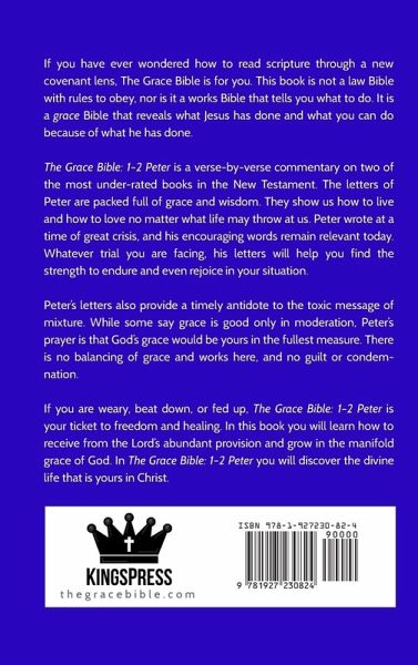 If you have ever wondered how to read scripture through a new covenant lens, The Grace Bible is for you. This book is not a law Bible with rules to obey, nor is it a works Bible that tells you what to do. It is a grace Bible that reveals what Jesus has done and what you can do because of what he has done. The Grace Bible: 1-2 Peter is a verse-by-verse commentary on two of the most under-rated books in the New Testament. The letters of Peter are packed full of grace and wisdom. They show us how to live and how to love no matter what life may throw at us. Peter wrote at a time of great crisis, and his encouraging words remain relevant today. Whatever trial you are facing, his letters will help you find the strength to endure and even rejoice in your situation. Peter's letters also provide a timely antidote to the toxic message of mixture. While some say grace is good only in moderation, Peter's prayer is that God's grace would be yours in the fullest measure. There is no balancing of grace and works here, and no guilt or condemnation. If you are weary, beat down, or fed up, The Grace Bible: 1-2 Peter is your ticket to freedom and healing. In this book you will learn how to receive from the Lord's abundant provision and grow in the manifold grace of God. In The Grace Bible: 1-2 Peter you will discover the divine life that is yours in Christ. ¿¿Key features:Word-for-word translation Keywords of grace introduced No guilt, no condemnation Over 600 notes covering every verse New covenant commentary Topical index Hardcover version offers larger 12-pt text Perfect gift for graduation, confirmation, Christmas, and more Publisher: KingsPress.org Reviews The "honey" of revelation oozes off the pages of The Grace Bible! The life-giving message of grace is what our world needs-and what we need to hear! Dive into this study and find the gold of God's grace! - Brian Simmons, lead translator of The Passion Translation, Passion & Fire Ministries One of my favorite resources is Paul Ellis's Grace Bible series. If you haven't discovered it yet, you will be wonderfully blessed. - Ed Elliott, president, Word of Life World Outreach The Grace Bible is the #1 resource I use when I want to understand God's word from a New Covenant perspective. I highly recommend it. - Joe Ganahl, lead pastor, Abundant Life Church, Brookings, SD If you're looking for a great commentary that is simple but not shallow, scholarly but not dry, and shows you the heart of Jesus in every passage, you've come to the right place. Do yourself a favor and start using The Grace Bible series! - Jeremy White, lead pastor, Valley Church of Vacaville, CA The Grace Bible series brings a much-needed and long-overdue New Covenant-based understanding to reading and understanding the Bible. It is a great study aid. - Lyn Packer, facilitator, New Zealand Prophetic Network In The Grace Bible Paul Ellis unearths a treasure trove of wonderful grace truth in a way very few have. It stands as a great study resource, highly recommended. - Tony Ide, lead pastor, Freedom Life Church, Perth, Australia Finally a study Bible that stays faithful to scripture and true to the gospel of grace. Your life and ministry will benefit greatly just as mine has from this grace-centered commentary of the New Testament. - Nate Tanner, evangelist at L3 Ministries International