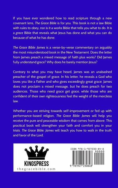 If you have ever wondered how to read scripture through a new covenant lens, The Grace Bible is for you. This book is not a law Bible with rules to obey, nor is it a works Bible that tells you what to do. It is a grace Bible that reveals what Jesus has done and what you can do because of what he has done. The Grace Bible: James is a verse-by-verse commentary on arguably the most misunderstood book in the New Testament. Does the letter from James preach a mixed message of faith plus works? Did James fully understand grace? Why does he barely mention Jesus? Contrary to what you may have heard, James was an unabashed preacher of the gospel of grace. In his letter, he reveals a God who loves you like a Father and who gives exceedingly great grace. James does not proclaim a mixed message, but he does preach for two audiences. Those who need grace get grace, while those who are confident of their own righteousness feel the weight of the merciless law. If you are done striving towards self-improvement or are fed up with performance-based religion, The Grace Bible: James will help you receive the pure and peaceable wisdom that comes from above. This practical book will strengthen your faith and comfort you in your trials. The Grace Bible: James will teach you how to walk in the truth and favor of the Lord. Key features: * Word-for-word translation * Keywords of grace introduced * Over 400 notes covering every verse * Topical index * Hardcover version offers larger 12-pt text * Perfect gift for graduation, confirmation, Christmas, and more * Publisher: KingsPress.org