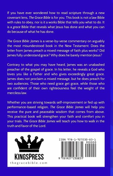 If you have ever wondered how to read scripture through a new covenant lens, The Grace Bible is for you. This book is not a law Bible with rules to obey, nor is it a works Bible that tells you what to do. It is a grace Bible that reveals what Jesus has done and what you can do because of what he has done. The Grace Bible: James is a verse-by-verse commentary on arguably the most misunderstood book in the New Testament. Does the letter from James preach a mixed message of faith plus works? Did James fully understand grace? Why does he barely mention Jesus? Contrary to what you may have heard, James was an unabashed preacher of the gospel of grace. In his letter, he reveals a God who loves you like a Father and who gives exceedingly great grace. James does not proclaim a mixed message, but he does preach for two audiences. Those who need grace get grace, while those who are confident of their own righteousness feel the weight of the merciless law. If you are done striving towards self-improvement or are fed up with performance-based religion, The Grace Bible: James will help you receive the pure and peaceable wisdom that comes from above. This practical book will strengthen your faith and comfort you in your trials. The Grace Bible: James will teach you how to walk in the truth and favor of the Lord. Key features: ¿Word-for-word translation ¿Keywords of grace introduced ¿Over 400 notes covering every verse ¿Topical index ¿Compact paperback version ¿Perfect gift for graduation, confirmation, Christmas, and more ¿Publisher: KingsPress.org