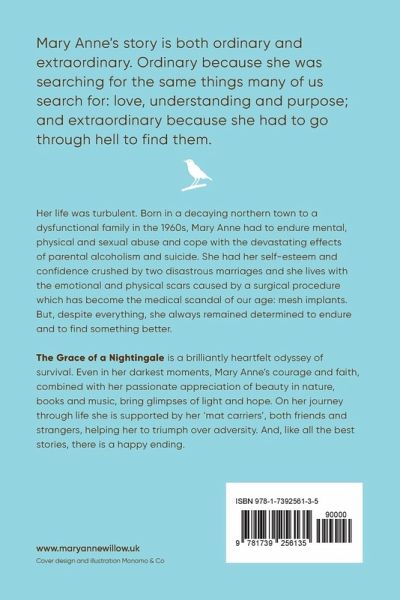 Mary Anne's award winning memoir is both ordinary and extraordinary. Ordinary because she was searching for the same things many of us search for: love, understanding and purpose; and extraordinary because she had to go through hell to find them. Her life was turbulent. Born in a decaying northern town to a dysfunctional family in the 1960s, Mary Anne had to endure mental, physical and sexual abuse and cope with the devastating effects of parental alcoholism and suicide. She had her self-esteem and confidence crushed by two disastrous marriages and she lives with the emotional and physical scars caused by a surgical procedure which has become the medical scandal of our age: mesh implants. But, despite everything, she always remained determined to endure and to find something better. On her journey through life she is supported by her 'mat carriers', both friends and strangers, helping her to triumph over adversity. Even in her darkest moments, Mary Anne's courage and faith, combined with her passionate appreciation of beauty in nature, books and music, bring glimpses of light and hope.The Grace of a Nightingale is a brilliantly heartfelt odyssey of survival, and, like all the best stories, there is a happy ending.