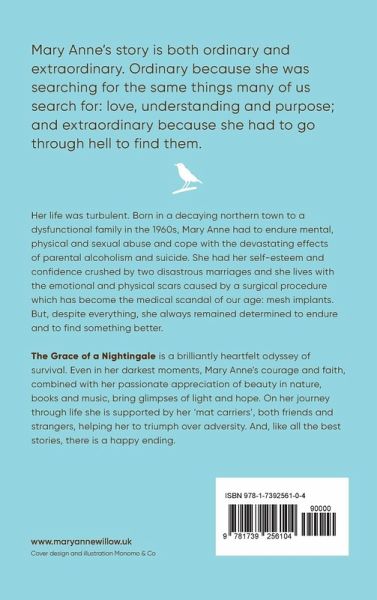 Mary Anne's award winning memoir is both ordinary and extraordinary. Ordinary because she was searching for the same things many of us search for: love, understanding and purpose; and extraordinary because she had to go through hell to find them. Her life was turbulent. Born in a decaying northern town to a dysfunctional family in the 1960s, Mary Anne had to endure mental, physical and sexual abuse and cope with the devastating effects of parental alcoholism and suicide. She had her self-esteem and confidence crushed by two disastrous marriages and she lives with the emotional and physical scars caused by a surgical procedure which has become the medical scandal of our age: mesh implants. But, despite everything, she always remained determined to endure and to find something better. On her journey through life she is supported by her 'mat carriers', both friends and strangers, helping her to triumph over adversity. Even in her darkest moments, Mary Anne's courage and faith, combined with her passionate appreciation of beauty in nature, books and music, bring glimpses of light and hope.The Grace of a Nightingale is a brilliantly heartfelt odyssey of survival, and, like all the best stories, there is a happy ending.