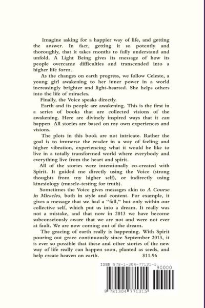 Imagine asking for a happier way of life, and getting the answer. In fact, getting it so potently and thoroughly, that it takes months to fully understand and unfold. Earth and its people are awakening. This is a collection of divinely inspired stories and messages of how that awakening can happen. A Light Being describes how its people overcame difficulties and transformed into a higher order life form. As the changes on earth progress we follow Celeste, a young girl helping others to live in a new way. Finally, the Voice speaks directly revealing several significant events of 2013 for humankind, including awakening from the dream subconsciously. The book allows you to feel the awakening, open your mind and spirit to happy possibilities, and attract a brighter way of life.