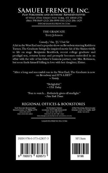 Adapted for the stage by Terry Johnson Based on the novel by Charles Webb and the screenplay by Calder Willingham and Buck Henry Comedy Characters: 6 male, 5 female Unit set. A hit in the West End and a popular show on Broadway starring Kathleen Turner, The Graduate brings the inspired movie hit of the Sixties vividly to life on stage. Benjamin Braddock, recent college graduate and prodigal son, returns home and promptly becomes embroiled in a