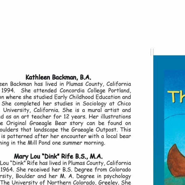 Kathleen Backman, B.A. Kathleen Backman has lived in Plumas County, California since 1994. She attended Concordia College Portland, Oregon where she studied Early Childhood Education and Art. She completed her studies in Sociology at Chico State University, California. She is a mural artist and worked as an art teacher for 12 years. Her illustrations of the Original Graeagle Bear story can be found on the boulders that landscape the Graeagle Outpost. This story is patterned after her encounter with a local bear swimming in the Mill Pond one summer morning. Mary Lou "Dink" Rife B.S., M.A. Mary Lou "Dink" Rife has lived in Plumas County, California since 1964. She received her B.S. Degree from Colorado University, Boulder and her M. A. Degree in psychology from The University of Northern Colorado, Greeley. She is a retired school teacher and counselor and worked with all grade levels. "Dink" enjoys writing stories, poems, and greeting cards in rhyme. This is her first children?s story.