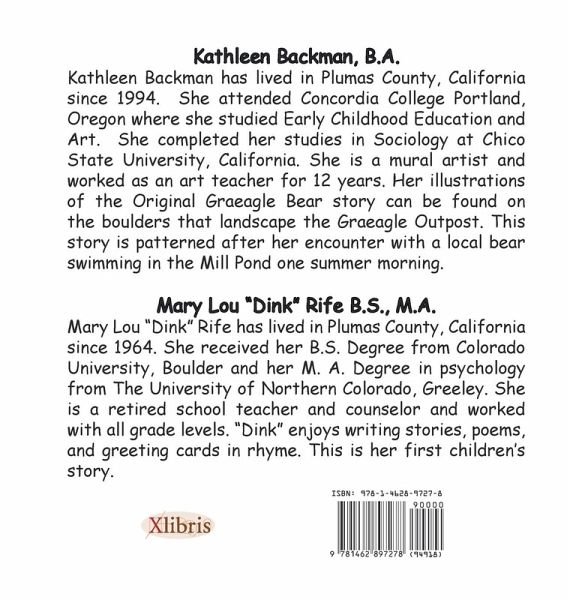 Kathleen Backman, B.A. Kathleen Backman has lived in Plumas County, California since 1994. She attended Concordia College Portland, Oregon where she studied Early Childhood Education and Art. She completed her studies in Sociology at Chico State University, California. She is a mural artist and worked as an art teacher for 12 years. Her illustrations of the Original Graeagle Bear story can be found on the boulders that landscape the Graeagle Outpost. This story is patterned after her encounter with a local bear swimming in the Mill Pond one summer morning. Mary Lou "Dink" Rife B.S., M.A. Mary Lou "Dink" Rife has lived in Plumas County, California since 1964. She received her B.S. Degree from Colorado University, Boulder and her M. A. Degree in psychology from The University of Northern Colorado, Greeley. She is a retired school teacher and counselor and worked with all grade levels. "Dink" enjoys writing stories, poems, and greeting cards in rhyme. This is her first children?s story.