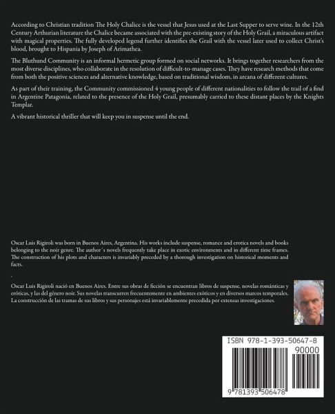 According to Christian tradition The Holy Chalice is the vessel that Jesus used at the Last Supper to serve wine. In the 12th Century Arthurian literature the Chalice became associated with the pre-existing story of the Holy Grail, a miraculous artifact with magical properties. The fully developed legend further identifies the Grail with the vessel later used to collect Christ's blood, brought to Hispania by Joseph of Arimathea. The Bluthund Community is an informal hermetic group formed on social networks. It brings together researchers from the most diverse disciplines, who collaborate in the resolution of difficult-to-manage cases. They have research methods that come from both the positive sciences and alternative knowledge, based on traditional wisdom, in arcana of different cultures. As part of their training, the Community commissioned 4 young people of different nationalities to follow the trail of a find in Argentine Patagonia, related to the presence of the Holy Grail, presumably carried to these distant places by the Knights Templar. A vibrant historical thriller that will keep you in suspense until the end.