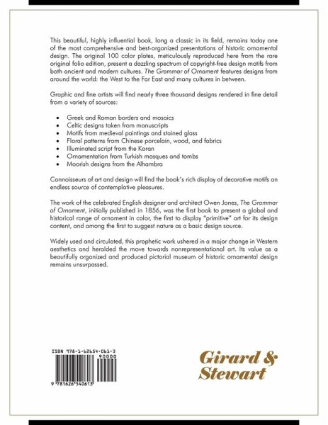 This beautiful, highly influential book, long a classic in its field, remains today one of the most comprehensive and best-organized presentations of historic ornamental design. The original 100 color plates, meticulously reproduced here from the rare original folio edition, present a dazzling spectrum of copyright-free design motifs from both ancient and modern cultures. The Grammar of Ornament features designs from around the world: the West to the Far East and many cultures in between. Graphic and fine artists will find nearly three thousand designs rendered in fine detail from a variety of sources: Greek and Roman borders and mosaics Celtic designs taken from manuscripts Motifs from medieval paintings and stained glass Floral patterns from Chinese porcelain, wood, and fabrics Illuminated script from the Koran Ornamentation from Turkish mosques and tombs Moorish designs from the Alhambra Connoisseurs of art and design will find the book's rich display of decorative motifs an endless source of contemplative pleasures. The work of the celebrated English designer and architect Owen Jones, The Grammar of Ornament, initially published in 1856, was the first book to present a global and historical range of ornament in color, the first to display "primitive" art for its design content, and among the first to suggest nature as a basic design source. Widely used and circulated, this prophetic work ushered in a major change in Western aesthetics and heralded the move towards nonrepresentational art. Its value as a beautifully organized and produced pictorial museum of historic ornamental design remains unsurpassed.