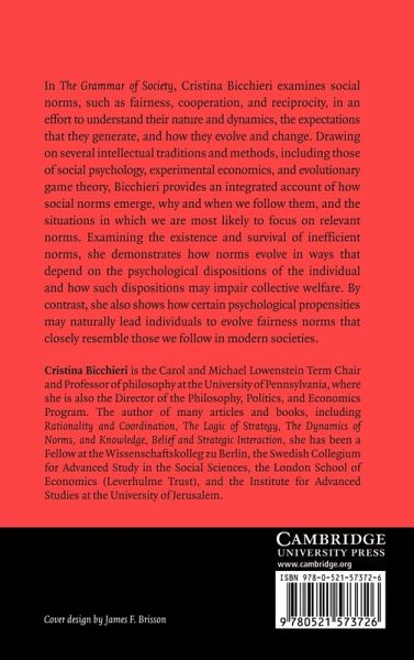 In The Grammar of Society, first published in 2006, Cristina Bicchieri examines social norms, such as fairness, cooperation, and reciprocity, in an effort to understand their nature and dynamics, the expectations that they generate, and how they evolve and change. Drawing on several intellectual traditions and methods, including those of social psychology, experimental economics and evolutionary game theory, Bicchieri provides an integrated account of how social norms emerge, why and when we follow them, and the situations where we are most likely to focus on relevant norms. Examining the existence and survival of inefficient norms, she demonstrates how norms evolve in ways that depend upon the psychological dispositions of the individual and how such dispositions may impair social efficiency. By contrast, she also shows how certain psychological propensities may naturally lead individuals to evolve fairness norms that closely resemble those we follow in most modern societies.