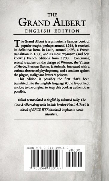 THE GRAND ALBERT ENGLISH EDITION Or better known as LES ADMIRABLES SECRETS D'ALBERT LE GRAND, The Grand Albert is a grimoire, a famous book of popular magic, perhaps around 1245, it received its definitive form, in Latin, around 1493, a French translation in 1500, and its most expansive (and best known) French editions from 1703. Containing several treatises on the design of Women, the Virtues of Herbs, Precious Stones, &Animals. Increased with a curious abstract of physiognomy, and a condom against the plague, malignant fevers & poisons. This edition is possibly the first that's been translated into the English language & the layout kept as close to the original to keep this book as authentic as possible. Edited & translated to English by Edmund Kelly The Grand Albert along with its little brother Petit Albert is a book of SECRETS that hold its place in occult literature.