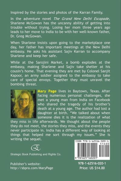 In the adventure novel The Grand New Delhi Escapade, Sharlene McGowan has the uncanny ability of getting into trouble without trying. Losing her mom three years ago leads to her move to India to be with her well-known father, Dr. Greg McGowan. When Sharlene insists upon going to the marketplace one day, her father has important meetings at the New Delhi embassy. He asks his assistant Sajiv Karran to accompany Sharlene and keep her safe. While at the Sarojini Market, a bomb explodes at the embassy, making Sharlene and Sajiv take shelter at his cousin's home. That evening they are met by Colonel Sanjit Kapoor, an army soldier assigned to the embassy to take care of special envoys. Together they must unravel the bombing threat. Mary Page lives in Baytown, Texas. After facing numerous personal challenges, she met a young man from India on Facebook who shared the tragedy of his brother's death at a young age. The author had lost a daughter at birth. "We talked about when someone dies it is the realization of what they they miss in life afterwards. We thought about the people they do not meet, the stories they miss, and the events they never participate in. India has a different way of looking at things that helped me sort through my issues." She is writing the sequel.