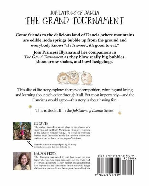 Come friends to the delicious land of Dancia, where mountains are edible, soda springs bubble up from the ground and everybody knows "if it's sweet, it's good to eat." Join Princess Illyana and her companions in The Grand Tournament as they blow really big bubbles, shoot arrow snakes, and bowl hedgehogs. The Grand Tournament finds Sir Sylas and friends converging at the palace to reunite with Princess Illyana and to compete in the tournament. Slowpoke, Sylas' steed, can't seem to stay out of mischief. Princess Illyana is exercising her statesmanship officiating the tournament, but she has a surprise up her sleeve. Competitions ensue and good natured rivalries are formed. This book explores a theme of winning and losing. With hand painted watercolor illustrations on all 46 pages this book was created to delight children of all ages.