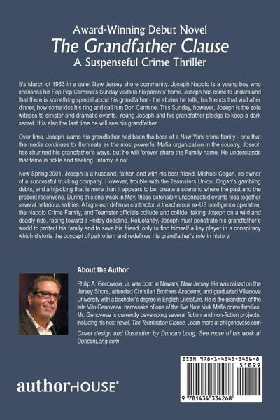 AWARDS for THE GRANDFATHER CLAUSE FIRST PRIZE WINNER FOR FICTION Santa Fe Trail Creative Arts Council Fiction Book Award SEMI-FINALIST FOR FICTION, SUSPENSE/THRILLER CATEGORY The Eric Hoffer Award HONORABLE MENTION FOR GENERAL FICTION The Los Angeles Book Festival It's March of 1963 in a quiet New Jersey shore community. Joseph Napolo is a young boy who cherishes his Pop Pop Carmine's Sunday visits to his parents' home. Joseph has come to understand that there is something special about his grandfather - the stories he tells, his friends that visit after dinner, how some kiss his ring and call him Don Carmine. This Sunday, however, Joseph is the sole witness to sinister and dramatic events. Young Joseph and his grandfather pledge to keep a dark secret. It is also the last time he will see his grandfather. Over time, Joseph learns his grandfather had been the boss of one of the five New York crime families, which still bears his name and continues to be illuminated as the most powerful Mafia organization in the country. Joseph has shunned his grandfather's ways but he will forever share the family name. He understands that fame is fickle and fleeting. Infamy is not. Now Spring 2001, Joseph is a husband, father, and with his best friend, Michael Cogan, co-owner of a successful trucking company. However, trouble with the Teamsters Union, Cogan's gambling debts, and a hijacking that is much more than it appears to be, create a scenario where the past and the present reconvene. During this one week in May, these ostensibly unconnected events toss together several nefarious entities. A high-tech defense contractor, a treacherous ex-US intelligence operative, the Napolo Crime Family, and Teamster officials collude and collide, taking Joseph on a wild and deadly ride, racing toward a Friday deadline. Reluctantly, Joseph must penetrate his grandfather's world to protect his family and to save his friend, only to find himself a key player in a conspiracy which distorts the concept of patriotism and redefines his grandfather's role in history. Please visit philgenovese.com for more information.