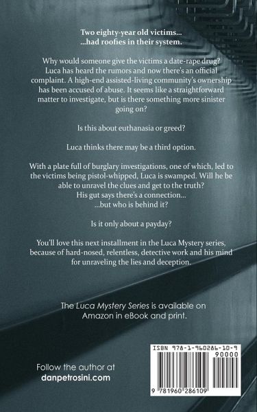 Two eighty-year old victims... ...had roofies in their system. Why would someone give the victims a date-rape drug? Luca has heard the rumors and now there's an official complaint. A high-end assisted-living community's ownership has been accused of abuse. It seems like a straightforward matter to investigate, but is there something more sinister going on? Is this about euthanasia or greed? Luca thinks there may be a third option. With a plate full of burglary investigations, one of which, led to the victims being pistol-whipped, Luca is swamped. Will he be able to unravel the clues and get to the truth? His gut says there's a connection... ...but who is behind it? Is it only about a payday? You'll love this next installment in the Luca Mystery series, because of hard-nosed, relentless, detective work and his mind for unraveling the lies and deception. *You can enter the Luca Mystery Series with any book. Start now.
