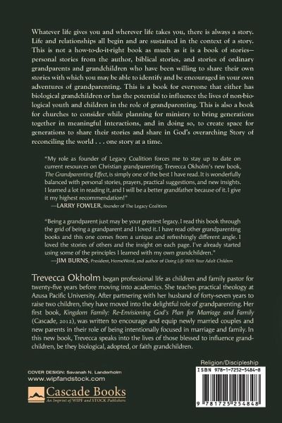 Trevecca Okholm began professional life as children and family pastor for twenty-five years before moving into academics. She teaches practical theology at Azusa Pacific University. After partnering with her husband of forty-seven years to raise two children, they have moved into the delightful role of grandparenting. Her first book, Kingdom Family: Re-Envisioning God's Plan for Marriage and Family (Cascade, 2012), was written to encourage and equip newly married couples and new parents in their role of being intentionally focused in marriage and family. In this new book, Trevecca speaks into the lives of those blessed to influence grandchildren, be they biological, adopted, or faith grandchildren.