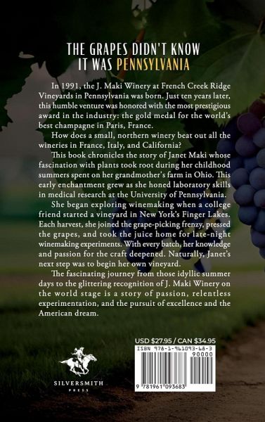 In 1991, the J. Maki Winery at French Creek Ridge Vineyards in Pennsylvania was born. Just ten years later, this humble venture was honored with the most prestigious award in the industry: the gold medal for the world's best champagne in Paris, France. How does a small, northern winery beat out all the wineries in France, Italy, and California? This book chronicles the story of Janet Maki whose fascination with plants took root during her childhood summers spent on her grandmother's farm in Ohio. This early childhood enchantment grew as she honed laboratory skills in medical research at the University of Pennsylvania. She began exploring winemaking when a college friend started a vineyard in New York's Finger Lakes. Each harvest, she joined the grape-picking frenzy, pressed the grapes, and took the grapes home for late night winemaking experiments. With every batch, her knowledge and passion for the craft deepened. Naturally, Janet's next step was to begin her own vineyard. This fascinating journey from those idyllic summer days to the glittering recognition of J. Maki Winery on the world's stage is a story of passion, relentless experimentation, and the pursuit of excellence and the American dream.