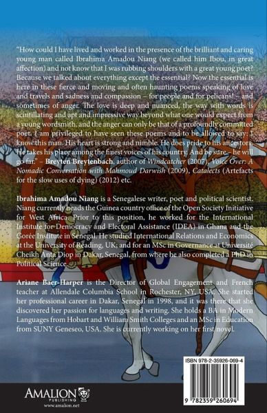 "How could I have lived and worked in the presence of the brilliant and caring young man called Ibrahima Amadou Niang (we called him Ibou, in great affection) and not know that I was rubbing shoulders with a great young poet? Because we talked about everything except the essential? Now the essential is here in these fierce and moving and often haunting poems speaking of love and travels and sadness and compassion - for people and for pelicans! - and sometimes of anger. The love is deep and nuanced, the way with words is scintillating and apt and impressive way beyond what one would expect from a young wordsmith, and the anger can only be that of a profoundly committed poet. I am privileged to have seen these poems and to be allowed to say: I know this man. His heart is strong and nimble. He does pride to his ancestors. He takes his place among the finest voices of his country. And be sure - he will go far." - Breyten Breytenbach, author of Windcatcher (2007), Voice Over: A Nomadic Conversation with Mahmoud Darwish (2009), Catalects (Artefacts for the slow uses of dying) (2012) etc. Ibrahima Amadou Niang is a Senegalese writer, poet and political scientist. Niang currently heads the Guinea country office of the Open Society Initiative for West Africa (OSIWA). Prior to this position, he worked for the International Institute for Democracy and Electoral Assistance (IDEA) in Ghana and the Gorée Institute in Senegal. He studied International Relations and Economics at the University of Reading, UK; and for an MSc in Governance at Université Cheikh Anta Diop in Dakar, Senegal, from where he also completed a PhD in Political Science. Ariane Baer-Harper is the Director of Global Engagement and French teacher at Allendale Columbia School in Rochester, NY, USA. She started her professional career in Dakar, Senegal in 1998, and it was there that she discovered her passion for languages and writing. She holds a BA in Modern Languages from Hobart and William Smith Colleges and an MSc in Education from SUNY Geneseo, USA. She is currently working on completing her first novel.