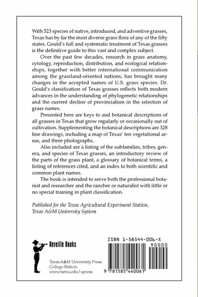 With 523 species of native, introduced, and adventive grasses, Texas has by far the most diverse grass flora of any of the fifty states. Gould's full and systematic treatment of Texas grasses is the definitive guide to this vast and complex subject. Over the past few decades, research in grass anatomy, cytology, reproduction, distribution, and ecological relationships, together with better international communication among the grassland-oriented nations, has brought many changes in the accepted names of U.S. grass species. Dr. Gould's classification of Texas grasses reflects both modern advances in the understanding of phylogenetic relationships and the current decline of provincialism in the selection of grass names. Presented here are keys to and botanical descriptions of all grasses in Texas that grow regularly or occasionally out of cultivation. Supplementing the botanical descriptions are 328 line drawings, including a map of Texas' ten vegetational areas, and three photographs. Also included are a listing of the subfamilies, tribes, genera, and species of Texas grasses, an introductory review of the parts of the grass plant, a glossary of botanical terms, a listing of references cited, and an index to both scientific and common plant names. The book is intended to serve both the professional botanist and researcher and the rancher or naturalist with little or no special training in plant classification.