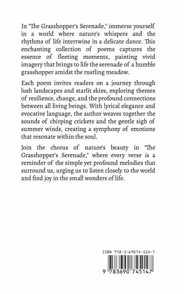 In "The Grasshopper's Serenade," immerse yourself in a world where nature's whispers and the rhythms of life intertwine in a delicate dance. This enchanting collection of poems captures the essence of fleeting moments, painting vivid imagery that brings to life the serenade of a humble grasshopper amidst the rustling meadow. Each poem invites readers on a journey through lush landscapes and starlit skies, exploring themes of resilience, change, and the profound connections between all living beings. With lyrical elegance and evocative language, the author weaves together the sounds of chirping crickets and the gentle sigh of summer winds, creating a symphony of emotions that resonate within the soul. Join the chorus of nature's beauty in "The Grasshopper's Serenade," where every verse is a reminder of the simple yet profound melodies that surround us, urging us to listen closely to the world and find joy in the small wonders of life.