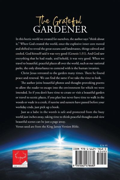 In this hectic world we created for ourselves, the author says "think about it." When God created the world, once the explosive inner core moved and shifted to reveal the great oceans and landmasses, things calmed and cooled. God himself said it was very good (Genesis 1:31). And God saw everything that he had made, and behold, it was very good. When we travel to beautiful, peaceful places all over the world, such as our national parks, the only disturbance to contend with is the human invasion. Christ Jesus retreated to the garden many times. There he found peace and renewal. We can find the same if we take the time to look. The author joins beautiful photos and thought-provoking poems to allow the reader to escape into the environment for which we were intended into. So if you don't have time to create or visit a beautiful garden or travel to scenic places, if you plan but never have time to walk in the woods or wade in a creek, if sunrise and sunsets have passed before your workday ends, just pick up a book. Just as a babe in the womb is safe and protected from the busy world just inches away, taking time to think peaceful thoughts and view beautiful scenes can be just a page away. Verses used are from the King James Version Bible.