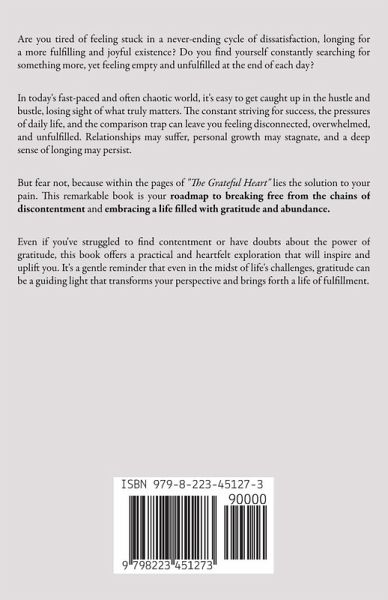 Are you tired of feeling stuck in a never-ending cycle of dissatisfaction, longing for a more fulfilling and joyful existence? Do you find yourself constantly searching for something more, yet feeling empty and unfulfilled at the end of each day? In today's fast-paced and often chaotic world, it's easy to get caught up in the hustle and bustle, losing sight of what truly matters. The constant striving for success, the pressures of daily life, and the comparison trap can leave you feeling disconnected, overwhelmed, and unfulfilled. Relationships may suffer, personal growth may stagnate, and a deep sense of longing may persist. But fear not, because within the pages of "The Grateful Heart" lies the solution to your pain. This remarkable book is your roadmap to breaking free from the chains of discontentment and embracing a life filled with gratitude and abundance. Here's why "The Grateful Heart" is a must-read:Embrace Lasting Happiness: Learn how gratitude can shift your perspective, rewiring your brain for positivity and unlocking a lasting sense of happiness and contentment. Cultivate Meaningful Relationships: Discover how gratitude can transform your relationships, deepening connections, fostering empathy, and enhancing the love and appreciation you share with others. Unlock Personal Growth: Tap into the power of gratitude to fuel your personal growth journey. Embrace self-reflection, embrace self-reflection, and use gratitude as a catalyst for self-improvement, resilience, and fulfillment. Experience Inner Peace: Find solace and serenity in the practice of gratitude, as it helps you let go of negativity, cultivate mindfulness, and embrace the present moment with a sense of calm and gratitude. Embrace Abundance: Discover how gratitude opens the door to abundance in all aspects of your life. By focusing on what you have rather than what you lack, you'll attract more blessings, opportunities, and abundance into your life. and much more! Even if you've struggled to find contentment or have doubts about the power of gratitude, this book offers a practical and heartfelt exploration that will inspire and uplift you. It's a gentle reminder that even in the midst of life's challenges, gratitude can be a guiding light that transforms your perspective and brings forth a life of fulfillment. Don't miss out on the opportunity to live your best life, filled with gratitude and abundance. Embrace Gratitude and Transform Your Life - Get Your Copy Now!