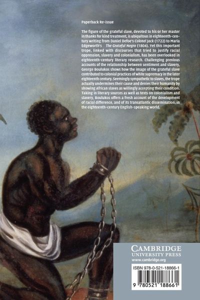 The figure of the grateful slave, devoted to his or her master in thanks for kind treatment, is ubiquitous in eighteenth-century writing from Daniel Defoe's Colonel Jack (1722) to Maria Edgeworth's 'The Grateful Negro' (1804). Yet this important trope, linked with discourses that tried to justify racial oppression, slavery and colonialism, has been overlooked in eighteenth-century literary research. Challenging previous accounts of the relationship between sentiment and slavery, in this book George Boulukos shows how the image of the grateful slave contributed to colonial practices of white supremacy in the later eighteenth century. Seemingly sympathetic to slaves, the trope actually undermines their cause and denies their humanity by showing African slaves as willingly accepting their condition. Taking in literary sources as well as texts on colonialism and slavery, Boulukos offers a fresh account of the development of racial difference, and of its transatlantic dissemination, in the eighteenth-century English-speaking world.