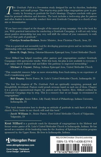 The Gratitude Path is a five-session study designed for use by churches, leadership teams, and small groups. This step-by-step guide helps congregations grow in generosity by focusing on gratitude for God's blessings. Chapters conclude with questions for personal reflection and devotion. The book includes a 12-step plan for pastors and other leaders to successfully conduct their own Gratitude Campaign in a church of any size or denomination. If you have ever cringed at the thought of the annual giving campaign, this is the book for you. With practical instruction for conducting a gratitude campaign, it will not only bring about positive stewardship but may very well shift the culture of your community to walk and live that path of gratitude. --Carolyn Scanlan-Holmes, Senior Minister, Avon Christian Church, Avon, IN This is a practical and accessible tool for developing generous givers, and an invitation into relationship with our bounteous God. --Bruce R. Ough, Bishop of the Minnesota Conference, UMC Kent Millard has helped countless other pastors and congregations conduct 'Gratitude Campaigns' with spectacular results. With this book his plan is now available to everyone. I hope many church leaders read and follow this pathway to improved stewardship. --Michael J. Coyner, Bishop of the Indiana Conference, UMC This wonderful resource helps us move stewardship from fundraising to an experience of God's transforming grace. --Rob Fuquay, Senior Pastor, St Lukes UMC, Indianapolis, IN The first five chapters of The Gratitude Path are spiritually energizing, personal, and thoughtfully devotional. Pastors could preach sermons based on each one of them. Chapter six is a pivotal organizational chapter for pastors and lay leaders. Here, Millard outlines his Gratitude Campaign step by step. This is a resource that we are happy to recommend to congregations. --Bill Enright, Senior Fellow, Lilly Family School of Philanthropy, Indiana University This book demonstrates how to develop an attitude of gratitude in each facet of the local church. Every leader in our church will read this book. --Jacob Williams, Jr., Senior Pastor, First Valparaiso UMC, Valparaiso, IN