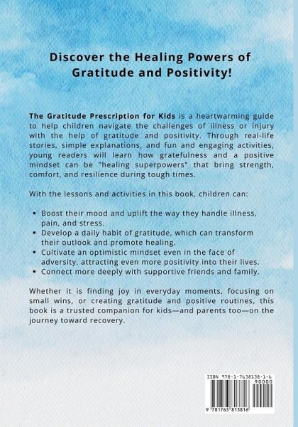 Could gratitude and positivity be the secret to helping your child feel stronger and recover faster? When facing illness or injury, it's perfectly natural for children to feel sad and down. However, The Gratitude Prescription for Kids reveals how finding reasons to be grateful and adopting a positive mindset can become their greatest healing superpowers yet! Based on the real-life journey of Valentina Fox, a nurse and gratitude and positivity advocate, and her daughter Emma, who was diagnosed with Acute Lymphoblastic Leukemia (ALL) at just 18 months old, this book shares powerful strategies on how gratitude, appreciation, and positivity can help a child overcome even the toughest of challenges. Through heartwarming stories, hands-on advice, simple explanations, and engaging activities, this book empowers young readers to embrace gratefulness and positivity as important "healing tools" in their recovery. This guide invites children on a transformative journey, teaching them to: Understand the mind-body connection and how creating a daily gratitude practice helps shift focus away from worries to highlight the good they have in life. Discover how being thankful and optimistic can make them feel happier and promote physical and emotional healing. Engage in numerous gratitude activities spread throughout the book! At the very least, kids will NOT be bored as they recuperate with fun activities such as creating a Gratitude Jar, starting a Gratitude Journal, practicing guided manifestation, crafting a Healing Vision Board, writing a Gratitude Letter, designing a Gratitude Mind Map, finding a Gratitude Stone, and more! Learn about developing a positive mindset (based on the principles of the Law of Attraction) so that they can attract even more positive experiences in their life. Find joy in everyday moments-whether it's a kind word, a cozy blanket, or a fun activity with friends. Strengthen connections with loved ones by expressing appreciation through thoughtful gratitude notes, random acts of kindness, and more. Overcome difficult feelings and build emotional strength by focusing and believing in their body's amazing ability to heal. The Gratitude Prescription for Kids is filled with tools and exercises that bring comfort, hope, and positive energy to children and families during tough times. Designed to support personal growth, healing, and connection, this book is an amazing gift to give your child right now. So, are you ready to help your child unlock the power of gratitude and positivity to make every day a step closer to healing? If you are, then grab your copy of this book today!