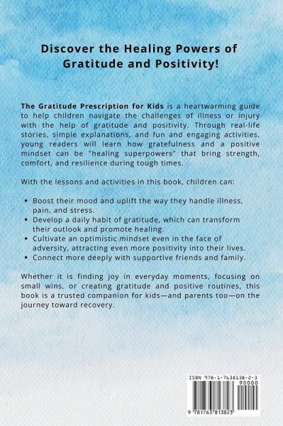 Could gratitude and positivity be the secret to helping your child feel stronger and recover faster? When facing illness or injury, it's perfectly natural for children to feel sad and down. However, The Gratitude Prescription for Kids reveals how finding reasons to be grateful and adopting a positive mindset can become their greatest healing superpowers yet! Based on the real-life journey of Valentina Fox, a nurse and gratitude and positivity advocate, and her daughter Emma, who was diagnosed with Acute Lymphoblastic Leukemia (ALL) at just 18 months old, this book shares powerful strategies on how gratitude, appreciation, and positivity can help a child overcome even the toughest of challenges. Through heartwarming stories, hands-on advice, simple explanations, and engaging activities, this book empowers young readers to embrace gratefulness and positivity as important "healing tools" in their recovery. This guide invites children on a transformative journey, teaching them to: Understand the mind-body connection and how creating a daily gratitude practice helps shift focus away from worries to highlight the good they have in life. Discover how being thankful and optimistic can make them feel happier and promote physical and emotional healing. Engage in numerous gratitude activities spread throughout the book! At the very least, kids will NOT be bored as they recuperate with fun activities such as creating a Gratitude Jar, starting a Gratitude Journal, practicing guided manifestation, crafting a Healing Vision Board, writing a Gratitude Letter, designing a Gratitude Mind Map, finding a Gratitude Stone, and more! Learn about developing a positive mindset (based on the principles of the Law of Attraction) so that they can attract even more positive experiences in their life. Find joy in everyday moments-whether it's a kind word, a cozy blanket, or a fun activity with friends. Strengthen connections with loved ones by expressing appreciation through thoughtful gratitude notes, random acts of kindness, and more. Overcome difficult feelings and build emotional strength by focusing and believing in their body's amazing ability to heal. The Gratitude Prescription for Kids is filled with tools and exercises that bring comfort, hope, and positive energy to children and families during tough times. Designed to support personal growth, healing, and connection, this book is an amazing gift to give your child right now. So, are you ready to help your child use gratitude and positivity to feel better every day? If you are, then scroll up and click the "Add to Cart" button today!
