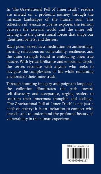 In "The Gravitational Pull of Inner Truth," readers are invited on a profound journey through the intricate landscapes of the human soul. This collection of evocative poems explores the tension between the external world and the inner self, delving into the gravitational forces that shape our identities, beliefs, and desires. Each poem serves as a meditation on authenticity, inviting reflections on vulnerability, resilience, and the quiet strength found in embracing one's true nature. With lyrical brilliance and emotional depth, the verses resonate with anyone who seeks to navigate the complexities of life while remaining anchored to their inner truth. Through stunning imagery and poignant language, the collection illuminates the path toward self-discovery and acceptance, urging readers to confront their innermost thoughts and feelings. "The Gravitational Pull of Inner Truth" is not just a book of poetry; it is an invitation to connect with oneself and to understand the profound beauty of vulnerability in the human experience.