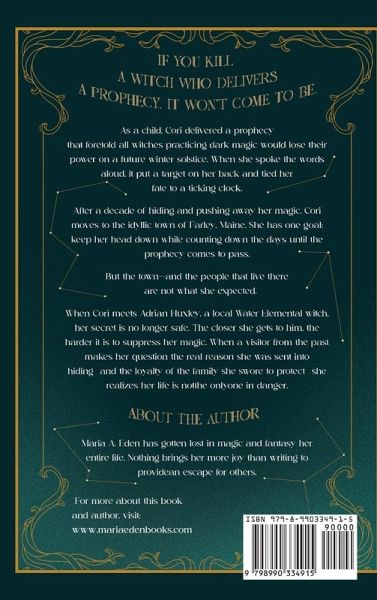 "If you kill a witch who delivers a prophecy, it won't come to be." As a child, Cori delivered a prophecy that foretold all witches practicing dark magic would lose their power on a future winter solstice. When she spoke the words aloud, it put a target on her back-and tied her fate to a ticking clock. After a decade of hiding and pushing away her magic, Cori moves to the idyllic town of Farley, Maine. She has one goal-keep her head down while counting down the days until the prophecy comes to pass. But the town-and the people that live there-are not what she expected. When Cori meets Adrian Huxley, a local Water Elemental witch, her secret is no longer safe. The closer she gets to him, the harder it is to suppress her magic. When a visitor from the past makes her question the real reason she was sent into hiding-and the loyalty of the family she swore to protect-she realizes her life is not the only one in danger. For fans of Spells for Forgetting and A Discovery of Witches comes an ethereal fantasy romance about a witch who must face the dark truths of her past-risking everything she loves and everything she has worked for.