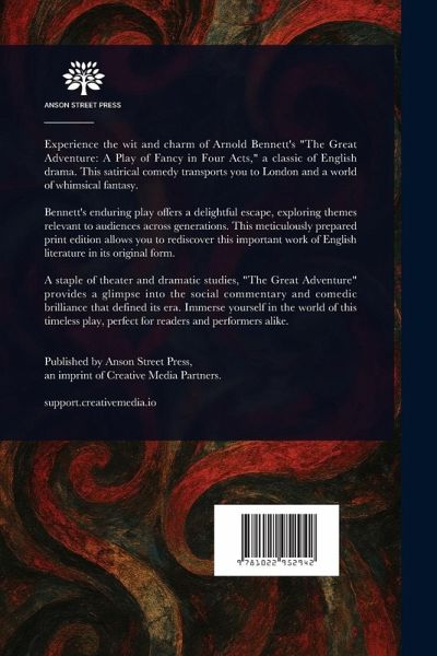 Experience the wit and charm of Arnold Bennett's "The Great Adventure: A Play of Fancy in Four Acts," a classic of English drama. This satirical comedy transports you to London and a world of whimsical fantasy. Bennett's enduring play offers a delightful escape, exploring themes relevant to audiences across generations. This meticulously prepared print edition allows you to rediscover this important work of English literature in its original form. A staple of theater and dramatic studies, "The Great Adventure" provides a glimpse into the social commentary and comedic brilliance that defined its era. Immerse yourself in the world of this timeless play, perfect for readers and performers alike. This work has been selected by scholars as being culturally important, and is part of the knowledge base of civilization as we know it. This work is in the public domain in the United States of America, and possibly other nations. Within the United States, you may freely copy and distribute this work, as no entity (individual or corporate) has a copyright on the body of the work. Scholars believe, and we concur, that this work is important enough to be preserved, reproduced, and made generally available to the public. We appreciate your support of the preservation process, and thank you for being an important part of keeping this knowledge alive and relevant.