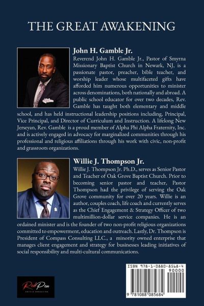 If you have ever wondered about the omnipresence of God, this text is a great expression of how God can be and speak with clarity the same message in two different places at the same time. How is God able to speak to you Monday through Friday on particular matters and then on Sunday the message is an echo of what God has been saying all week long? The Great Awakening is what happens when two kings collide, commit and champion the proclamation of the gospel during the most challenging times of our lives. Each chapter and text, though preached hundreds of miles apart in the same season, provides insight to historical events with profound present day implications. This book does more than inform. It empowers. It awakens its readers to the possibilities of life behind a closed door, an open grave, a processing pall and a sealed tomb! Reverend John H. Gamble Jr., Pastor of Smyrna Missionary Baptist Church in Newark, NJ, is a passionate pastor, preacher, bible teacher, and worship leader whose multifaceted gifts have afforded him numerous opportunities to minister across denominations, both nationally and abroad. A public school educator for over two decades, Rev. Gamble has taught both elementary and middle school, and has held instructional leadership positions including, Principal, Vice Principal, and Director of Curriculum and Instruction. A lifelong New Jerseyan, Rev. Gamble is a proud member of Alpha Phi Alpha Fraternity, Inc. and is actively engaged in advocacy for marginalized communities through his professional and religious affiliations through his work with civic, non-profit and grassroots organizations. Willie J. Thompson Jr. Ph.D., serves as Senior Pastor and Teacher of Oak Grove Baptist Church. Prior to becoming senior pastor and teacher, Pastor Thompson had the privilege of serving the Oak Grove community for over 20 years. Willie is an author, couples coach, life coach and currently serves as the Chief Engagement & Strategy Officer of two multimillion-dollar service companies. He is an ordained minister and is the founder of two non-profit religious organizations committed to empowerment, education and outreach. Lastly, Dr. Thompson is President of Compass Consulting LLC., a minority owned enterprise that manages client engagement and strategy for businesses leading initiatives of social responsibility and multi-cultural communications.