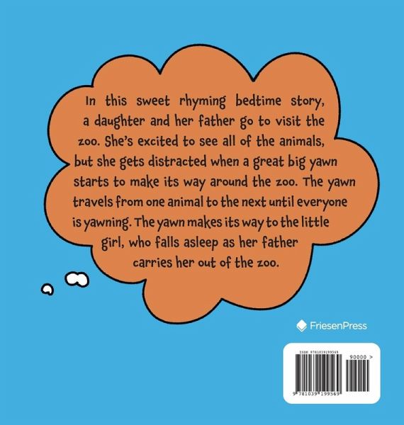 In this sweet rhyming bedtime story, a daughter and her father go to visit the zoo. She's excited to see all of the animals, but she gets distracted when a great big yawn starts to make its way around the zoo. The yawn travels from one animal to the next until everyone is yawning. The yawn makes its way to the little girl, who falls asleep as her father carries her out of the zoo.