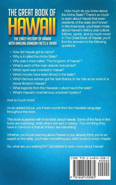 How much do you know about the Aloha State? There’s so much to learn about Hawaii that even residents of the state don’t know! In this trivia book, you’ll learn more about Hawaii’s history, pop culture, folklore, sports, and so much more! In The Great Book of Hawaii, you’ll find the answers to the following questions: How did Hawaii get its name? Why is it called the Aloha State? Why was it once called "The Kingdom of Hawaii"? Which sport was invented in Hawaii? Which movies have been filmed in the state? What legends from the Hawaiian culture haunt the state? What’s Hawaii’s most famous unsolved mystery? And so much more! As an added bonus, you’ll learn words from the Hawaiian language throughout the book. This book is packed with trivia facts about Hawaii. Some of the facts in this book are surprising, while others are sad or creepy. The one thing they have in common is that all of them are interesting! Whether you’re just learning about Hawaii or you already think you’re an expert on the state, you’ll learn something you didn’t know in every chapters. Your history teacher will be interesting at all of your newfound knowledge. So, what are you waiting for? Get started to learn more about Hawaii!