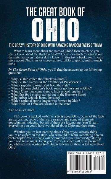 Want to learn more about the state of Ohio? How much do you really know about the Buckeye State? There's so much to learn about the state that even natives don't know! In this trivia book, you'll learn more about Ohio's history, pop culture, folklore, sports, and so much more! In The Great Book of Ohio, you'll find the answers to the following questions: Why is Ohio called the "Buckeye State"? Why is Ohio known as the "Mother of Presidents"? Which superhero originated from the state? Which Ohio musicians went to high school together? What urban legends haunt the state? Which national sports league was formed in Ohio? And so much more! This book is packed with trivia facts about Ohio. Some of the facts are surprising, some of them are strange, and some of them are goosebumps-inducing, but all of them are fascinating. You'll learn everything you could have wondered about Ohio and then some. Whether you're just learning about Ohio or you already think you're an expert on the state, you're bound to learn something new in each chapter. Your friends will be amazed at your knowledge during your next trivia night. Even your history teacher will be impressed! So, what are you waiting for? Dig in to learn all there is to know about Ohio!