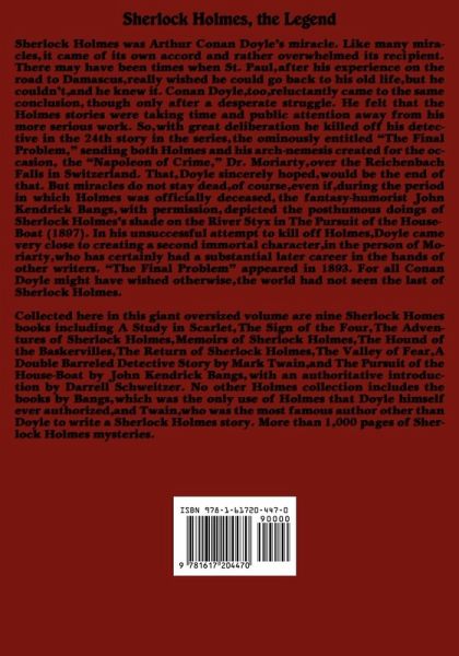 Sherlock Holmes, the Legend Sherlock Holmes was Arthur Conan Doyle's miracle. Like many miracles, it came of its own accord and rather overwhelmed its recipient. There may have been times when St. Paul, after his experience on the road to Damascus, really wished he could go back to his old life, but he couldn't, and he knew it. Conan Doyle, too, reluctantly came to the same conclusion, though only after a desperate struggle. He felt that the Holmes stories were taking time and public attention away from his more serious work. So, with great deliberation he killed off his detective in the 24th story in the series, the ominously entitled "The Final Problem," sending both Holmes and his arch-nemesis created for the occasion, the "Napoleon of Crime," Dr. Moriarty, over the Reichenbach Falls in Switzerland. That, Doyle sincerely hoped, would be the end of that. But miracles do not stay dead, of course, even if, during the period in which Holmes was officially deceased, the fantasy-humorist John Kendrick Bangs, with permission, depicted the posthumous doings of Sherlock Holmes's shade on the River Styx in The Pursuit of the House-Boat (1897). In his unsuccessful attempt to kill off Holmes, Doyle came very close to creating a second immortal character, in the person of Moriarty, who has certainly had a substantial later career in the hands of other writers. "The Final Problem" appeared in 1893. For all Conan Doyle might have wished otherwise, the world had not seen the last of Sherlock Holmes. Collected here in this giant oversized volume are nine Sherlock Homes books including A Study in Scarlet, The Sign of the Four, The Adventures of Sherlock Holmes, Memoirs of Sherlock Holmes, The Hound of the Baskervilles, The Return of Sherlock Holmes, The Valley of Fear, A Double Barreled Detective Story by Mark Twain, and The Pursuit of the House-Boat by John Kendrick Bangs, with an authoritative introduction by Darrell Schweitzer. No other Holmes collection includes the books by Bangs, which was the only use of Holmes that Doyle himself ever authorized, and Twain, who was the most famous author other than Doyle to write a Sherlock Holmes story. More than 1,000 pages of Sherlock Holmes mysteries.