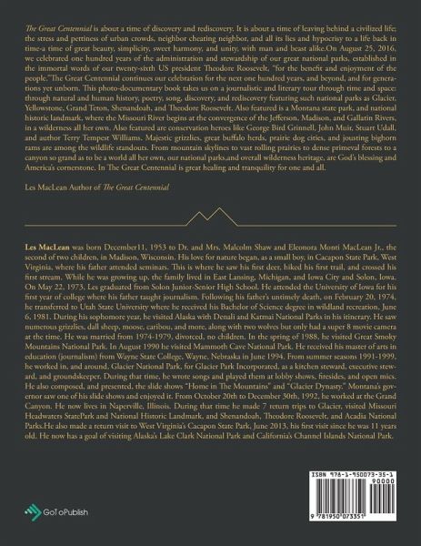 The Great CentennialThe Great Centennial is about a time of discovery and rediscovery. It is about a time of leaving behind a civilized life; the stress and pettiness of urban crowds, neighbor cheating neighbor, and all its lies and hypocrisy to a life back in time-a time of great beauty, simplicity, sweet harmony, and unity, with man and beast alike.On August 25, 2016, we celebrated one hundred years of the administration and stewardship of our great national parks, established in the immortal words of our twenty-sixth US president Theodore Roosevelt, "for the benefit and enjoyment of the people."The Great Centennial continues our celebration for the next one hundred years, and beyond, and for generations yet unborn. This photo-documentary book takes us on a journalistic and literary tour through time and space: through natural and human history, poetry, song, discovery, and rediscovery featuring such national parks as Glacier, Yellowstone, Grand Teton, Shenandoah, and Theodore Roosevelt. Also featured is a Montana state park, and national historic landmark, where the Missouri River begins at the convergence of the Jefferson, Madison, and Gallatin Rivers, in a wilderness all her own. Also featured are conservation heroes like George Bird Grinnell, John Muir, Stuart Udall, and author Terry Tempest Williams. Majestic grizzlies, great buffalo herds, prairie dog cities, and jousting bighorn rams are among the wildlife standouts. From mountain skylines to vast rolling prairies to dense primeval forests to a canyon so grand as to be a world all her own, our national parks,and overall wilderness heritage, are God's blessing and America's cornerstone. In The Great Centennial is great healing and tranquility for one and all. Les MacLean Author of The Great Centennial