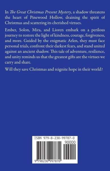 In The Great Christmas Present Mystery, a shadow threatens the heart of Pinewood Hollow, draining the spirit of Christmas and scattering its cherished virtues. Ember, Solon, Mira, and Lioren embark on a perilous journey to restore the light of kindness, courage, forgiveness, and more. Guided by the enigmatic Arlen, they must face personal trials, confront their darkest fears, and stand united against an ancient shadow. This tale of adventure, resilience, and unity reminds us that the greatest gifts are the virtues we carry and share. Will they save Christmas and reignite hope in their world?