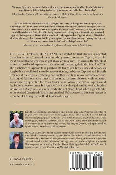 The Great Cyprus Think Tank is narrated by Bart Beasley, a dejected Canadian author of cultural memoirs who yearns to return to Cyprus, where he spent his youth and where he might shake off his ennui. He forms a think tank of renowned but flawed experts to tackle crises still besetting the fabled island in 2024. The birthplace of Aphrodite is parched, its famed sea turtles face extinction, its songbirds are swallowed whole by native epicures, and Greek Cypriots and Turkish Cypriots, if no longer dispatching one another, rarely send over a bottle of wine. A string of felicitous adventures and seeming successes follows, while romantic liaisons spring up within the think tank's ranks. Where else but in Cyprus could the Fellows hope to unearth Pygmalion's ancient showgirl sculpture of Aphrodite in time for Kataklysmós, an annual celebration of Noah's flood when Cypriots take to the sea and flirtatiously splash one another? Unknown to all but alert readers is a counterplot to waylay the think tank's best designs.