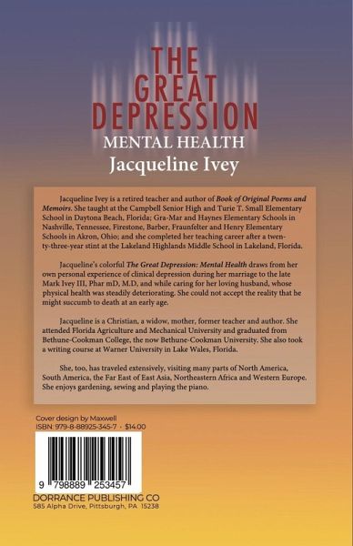 About the Book Jacqueline Ivey is a retired teacher and author of Book of Original Poems and Memoirs. She taught at the Campbell Senior High and Turie T. Small Elementary School in Daytona Beach, Florida; Gra-Mar and Haynes Elementary Schools in Nashville, Tennessee, Firestone, Barber, Fraunfelter and Henry Elementary Schools in Akron, Ohio; and she completed her teaching career after a twenty-three-year stint at the Lakeland Highlands Middle School in Lakeland, Florida. Jacqueline's colorful The Great Depression: Mental Health draws from her own personal experience of clinical depression during her marriage to the late Mark Ivey III, Phar mD, M.D, and while caring for her loving husband, whose physical health was steadily deteriorating. She could not accept the reality that he might succumb to death at an early age. Jacqueline is a Christian, a widow, mother, former teacher and author. She attended Florida Agriculture and Mechanical University and graduated from Bethune-Cookman College, the now Bethune-Cookman University. She also took a writing course at Warner University in Lake Wales, Florida. She, too, has traveled extensively, visiting many parts of North America, South America, the Far East of East Asia, Northeastern Africa and Western Europe. She enjoys gardening, sewing and playing the piano.