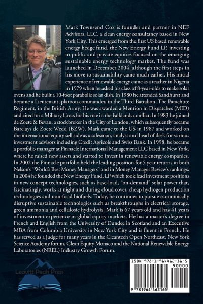 Mark Townsend Cox is the founder and partner in NEF Advisors, LLC, a clean energy consultancy based in New York City. This emerged from the first US based renewable energy hedge fund, the New Energy Fund LP, investing in public and private equities focused on the emerging sustainable energy technology market. The fund was launched in December 2004, although the first steps in his move to sustainability came much earlier. His initial experience of renewable energy came as a teacher in Nigeria in 1979 when he asked his class of 8-year-olds to make solar ovens and he built a 10-foot parabolic solar dish. In 1980 he attended Sandhurst and became a Lieutenant, platoon commander, in the Third Battalion, The Parachute Regiment, in the British Army. He was awarded a Mention in Dispatches (MID) and cited for a Military Cross for his role in the Falklands conflict. In 1983 he joined de Zoete & Bevan, a stockbroker in the City of London, which subsequently became Barclays de Zoete Wedd (BZW). Mark came to the US in 1987 and worked on the international equity sell side as a salesman, analyst and head of desk for various investment advisors including Credit Agricole and Swiss Bank. In 1998, he became a portfolio manager at Pinnacle International Management LLC based in New York, where he raised new assets and started to invest in renewable energy companies. In 2002 the Pinnacle portfolio held the leading position for 5 year returns in both Nelson's "World's Best Money Managers" and in Money Manager Review's rankings. In 2004 he founded the New Energy Fund, LP which took lead investment positions in new concept technologies, such as base-load, "on-demand" solar power that, fascinatingly, works at night and during cloud cover, cheap hydrogen production technologies and non-food biofuels. Today, he continues to pursue economically disruptive sustainable technologies such as breakthroughs in electrical storage, green ammonia and cellulosic hydrolysis.