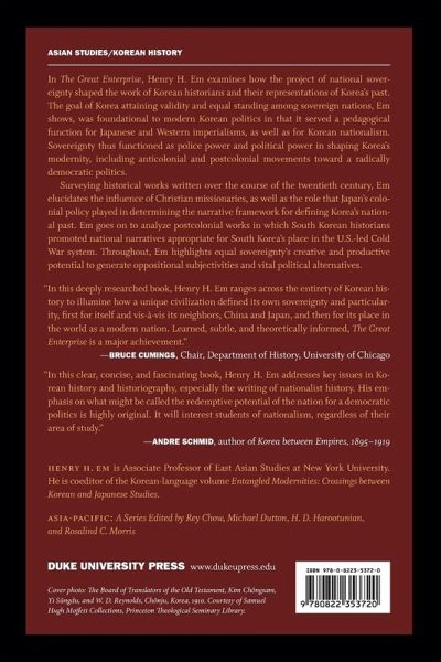 In The Great Enterprise, Henry H. Em examines how the project of national sovereignty shaped the work of Korean historians and their representations of Korea's past. The goal of Korea attaining validity and equal standing among sovereign nations, Em shows, was foundational to modern Korean politics in that it served a pedagogical function for Japanese and Western imperialisms, as well as for Korean nationalism. Sovereignty thus functioned as police power and political power in shaping Korea's modernity, including anticolonial and postcolonial movements toward a radically democratic politics. Surveying historical works written over the course of the twentieth century, Em elucidates the influence of Christian missionaries, as well as the role that Japan's colonial policy played in determining the narrative framework for defining Korea's national past. Em goes on to analyze postcolonial works in which South Korean historians promoted national narratives appropriate for South Korea's place in the U.S.-led Cold War system. Throughout, Em highlights equal sovereignty's creative and productive potential to generate oppositional subjectivities and vital political alternatives.