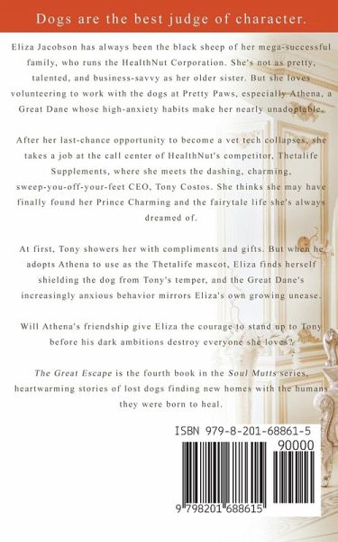 Dogs are the best judge of character. Eliza Jacobson has always been the black sheep of her mega-successful family, who runs the HealthNut Corporation. She's not as pretty, talented, and business-savvy as her older sister. But she loves volunteering to work with the dogs at Pretty Paws, especially Athena, a Great Dane whose high-anxiety habits make her nearly unadoptable. After her last-chance opportunity to become a vet tech collapses, she takes a job at the call center of HealthNut's competitor, Thetalife Supplements, where she meets the dashing, charming, sweep-you-off-your-feet CEO, Tony Costos. She thinks she may have finally found her Prince Charming and the fairytale life she's always dreamed of. At first, Tony showers her with compliments and gifts. But when he adopts Athena to use as the Thetalife mascot, Eliza finds herself shielding the dog from Tony's temper, and the Great Dane's increasingly anxious behavior mirrors Eliza's own growing unease. Will Athena's friendship give Eliza the courage to stand up to Tony before his dark ambitions destroy everyone she loves? The Great Escape is the fourth book in the Soul Mutts series, heartwarming stories of lost dogs finding new homes with the humans they were born to heal.