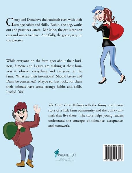 Gerry and Dana love their animals even with their strange habits and skills. Rubin, the dog, works out and practices karate. Mr. Moo, the cat, sleeps on cars and wants to drive. And Gilly, the goose, is quite the jokester. While everyone on the farm goes about their business, Simone and Legree, two well known robbers, are making it their business to observe everything and everyone on the farm. What are their intentions? Should Gerry and Dana be concerned? Maybe so, but lucky for them their animals have some strange habits and skills. Lucky? Yes! Why? You'll have to read the book. The Great Farm Robbery tells the funny and heroic story of a little farm community and the quirky animals that live there. The story helps young readers understand the concepts of tolerance, acceptance, and teamwork.