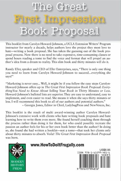 This booklet from Carolyn Howard-Johnson, a UCLA Extension Writers’ Program instructor for nearly a decade, helps authors love the project they most love to hate—writing a book proposal. She has taken the guessing out of the book proposal process. Now there is no need to take expensive, time-consuming classes or spend hours reading a tome to find the voice and format that will propel an author's idea from a dream to reality. This slim book and thirty minutes will do it. Randy Eller, speaker and CEO of Eller Enterprises, says, "There is only one thing you need to learn from Carolyn Howard-Johnson to succeed...everything she says!" "Marketing is never easy... Well, it might be if you follow the easy steps CarolynHoward-Johnson offers up in The Great First Impression Book Proposal: EverythingYou Need to Know About Selling Your Book in Thirty Minutes or Less, 2nd Ed.. Howard-Johnson’s bulleted lists are superior. They are easy to understand, easy to implement, and even easier to read. She means it when she says thirty minutes or less. I will recommend this book to all of our authors and potential authors." ~ Georgia Jones, Editor in Chief, LadybugPress and NewVoices, Inc. This booklet is the result of multi award-winning author Carolyn Howard-Johnson’s extensive work with clients who hate writing book proposals and hate learning how to write them even more. She found herself coaching them through the process rather than doing it for them, for who could possibly recreate the passion an author feels for his or her own book better than the author? In doing so, she found she had written a booklet—not a tome—that took her clients only about thirty minutes to absorb. Voila! The Great First Impression Book Proposa, 2nd Edition was born. The HowToDoItFrugally Series from Modern History Press www.ModernHIstoryPress.com